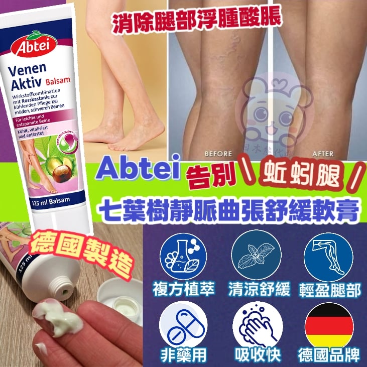 德國Abtei 七葉樹靜脈曲張舒緩軟膏 125ml 呢個產品出名又好用,德國百年品牌🇧🇪啲同事仔試過都話好掂👍🏻👍🏻 一google已經好評如潮‼️‼️萬人是實證有效😍 最近更有美容達人都稱佢為 「新一代瘦腿霜」!純天然植物提煉,帶有淡淡藥草清香 😊天天使用都無問題!快吸收不黏不膩,讓雙腿輕盈有活力,連孕婦都可以使用‼️ 香港好多人都有靜脈曲張既問題,絕大原因係雙腳長期站立所致😥尤其服務性行業真係好難避免,容易有腿部青筋突起、酸痛浮腫、發麻、疼痛抽筋等等問題。 靜脈曲張真係好難受,有時夜晚要浸熱水先訓得著🥹 如果你/身邊家人/朋友有以上問題 💥強烈推薦呢款德國百年老牌Abtei出產既七葉樹靜脈曲張舒緩軟膏💥 活性成分與七葉樹的組合可為疲憊、沉重的雙腿提供清涼護理及舒緩❣️ 主要成分: 七葉樹籽提取物、洋甘菊菊花提取物、山金車花提取物、紅沒藥醇、薄荷草本油、薄荷醇及香樟等 主要功效: ✅ 改善血液循環促進淋巴循環緊致腿部肌膚 ✅ 排除毒素及多餘水份,讓雙腿輕盈 ✅ 舒緩腿部僵硬、浮腫、靜脈曲張的狀況,使雙腿更加健康有彈性 ✅ 高效抗氧化物促進細胞新陳代謝、預防橘皮紋,使雙腿肌膚光潔細滑緊致 推薦使用人士: 1)從事經常長久站立既工作人員 2)久坐辦公室內工作既人士 3)深靜脈血栓形 4)妊娠婦女 5)小腿靜脈曲張 使用方法: 每日1-2次,以揉搓的方法自下而上的均勻塗抹於腿部 (如儲存於雪櫃及沐浴後使用效果更佳)。 塗抹時建議把腿翹到高處,這樣能更促進血液循環,效果更好。 生產地:德國