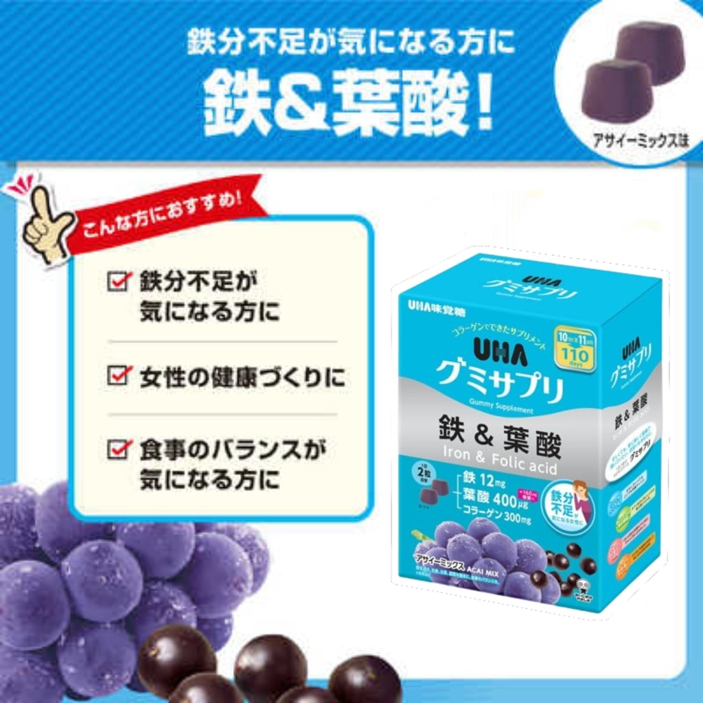 日本爆紅 UHA 補鐵+葉酸 營養補充味覺軟糖 加強版 女生恩物!輕鬆補鐵+葉酸 \爆紅/日本補充軟糖 💥加強版💥鐵含量增至12mg , 葉酸含量增至400mcg!仲係由膠原蛋白製成的補充劑😍 UHA一種獨特的技術,將營養成分穩定地鎖在軟糖中。 手腳冰冷救星‼️日本斷哂貨,爆紅嘅營養補充軟糖!仲要零脂肪,完成唔會有罪惡感😁只要每天2粒就可以,就可以輕輕補鐵+葉酸 一盒內有11小包,每包有10粒。想試下嘅朋友仔可以買2-3包,食開嘅朋友仔當然一定係成盒買啦💥隨時又缺貨嫁啦 最近日本的UHA「鐵&葉酸」 爆紅,原來大家都看中了補充劑的軟糖版本,覺得好方便!因為一般鐵補充液是十分難入口的!這款 「鐵&葉酸」有助肌膚紅潤,維持心血管健康,如果平時情緒煩躁易怒,這個也有幫助!巨峰提子味軟糖零脂肪,在日常生活中,隨時隨地補充膳食中未能吸收的營養,維持健康!難怪成為了網上爆紅軟糖😍 更有用後者說💥對於經痛亦有幫助,所以超級推介給有需要的女生! 食用方法:每天2粒 使用日期:2027.8 生產地:日本