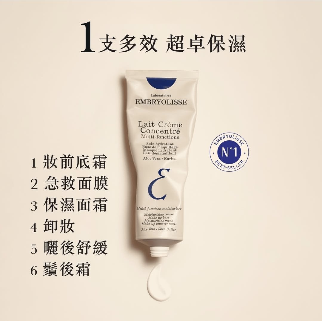法國 Embryolisse Lait-Crème Concentré 全能奇跡多效保濕霜 75ml 💥超多人推薦,原來真係好好用💥屋企點都要常備一支👍🏻👍🏻 超卓保濕,一支多功能護膚品,可用作保濕霜、妝前乳、保濕面膜和卸妝乳等多種用途。‼️‼️ ✅️ 有效滋潤、舒緩並修復肌膚 🌿 蘊含天然乳木果、蜂蠟、大豆蛋白及庫拉索蘆薈,成份精簡、溫和低敏,有強化肌底、修復、舒緩、加速細胞新陳代謝功效,而且不含Paraben類嘅防腐劑、色素、酒精、MIT/CMIT,極緻絲滑嘅質感,容易推開! 😍 如果當妝前底霜用再上粉,咁就全日都貼服唔會卡粉!又可以當面霜咁搽,比較乾既位置例如鼻翼同面部,可以再搽薄薄一層,再輕輕按摩幫助吸收! 🚨 如果當急救保濕面膜用就敷5-10分鐘再抹走就ok,或者當卸妝乳使用、曬後及剃鬚後舒緩用都得㗎,真係好多功效啊! 其配方不致粉刺,適合所有膚質,包括敏感肌膚。 1️⃣ 妝前底霜打造平滑服貼妝容,底妝持久唔浮粉 2️⃣ 急救面膜敷10分鐘,拯救疲憊乾燥肌膚 3️⃣ 保濕面霜日夜使用,全天候鎖水保濕 4️⃣ 卸妝溫和卸除彩妝,清潔同時唔傷肌膚屏障 5️⃣ 曬後舒緩修復曬後乾燥與泛紅,降溫保濕一步到位 6️⃣ 鬚後霜呵護剃鬚後敏感肌膚,舒緩乾燥與不適 生產地:法國