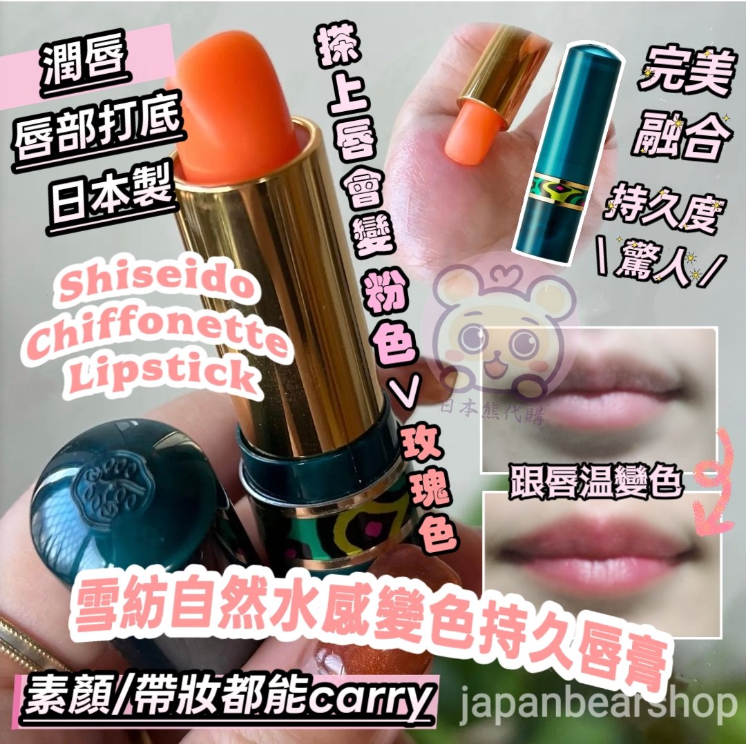 Shiseido Chiffonette Lipstick 自然水感變色持久唇膏 3.5g 😍 擦上後會呈現淡淡的粉色然後會呈現玫瑰色,因應個人唇色而有所不同! 💁🏻♀️Chiffonette 是Shiseido資生堂旗下一個1976年來歷史悠久的唇膏系列,以其濕潤的質地和能呈現淡淡桃粉玫瑰色的「復古私色唇膏」而聞名,它能潤澤雙唇並快速撫平唇紋‼️‼️ 💥 絕對是性價比超高,外貌包裝復古華麗有顏值,唇膏具有潤澤修護和持久的效果,絕對會令你有驚喜! 成分都是能滋潤和抗氧化👍🏻👍🏻 ✅️ 蓖麻油:可滋潤乾燥唇膚,並具有抗衰老功效。 ✅️ 橄欖果油:滋潤和修復的效果。 ✅️ 生育酚:抗氧化作用。 很容易塗抹的唇膏,打開它看起來是橙色的,但塗抹後會變成粉紅色,漸漸變成玫瑰色,並逐漸沾染唇膚,與你的唇色完美融合。而且色彩持久度驚人! ✅️ 每個人都可以改變不同的顏色,無論素顏/帶妝都可以carry! 它易於混合,不易乾燥,並且具有出色的保色性。因為顏色比較自然的,所以也可以當唇部打底。 生產地:日本