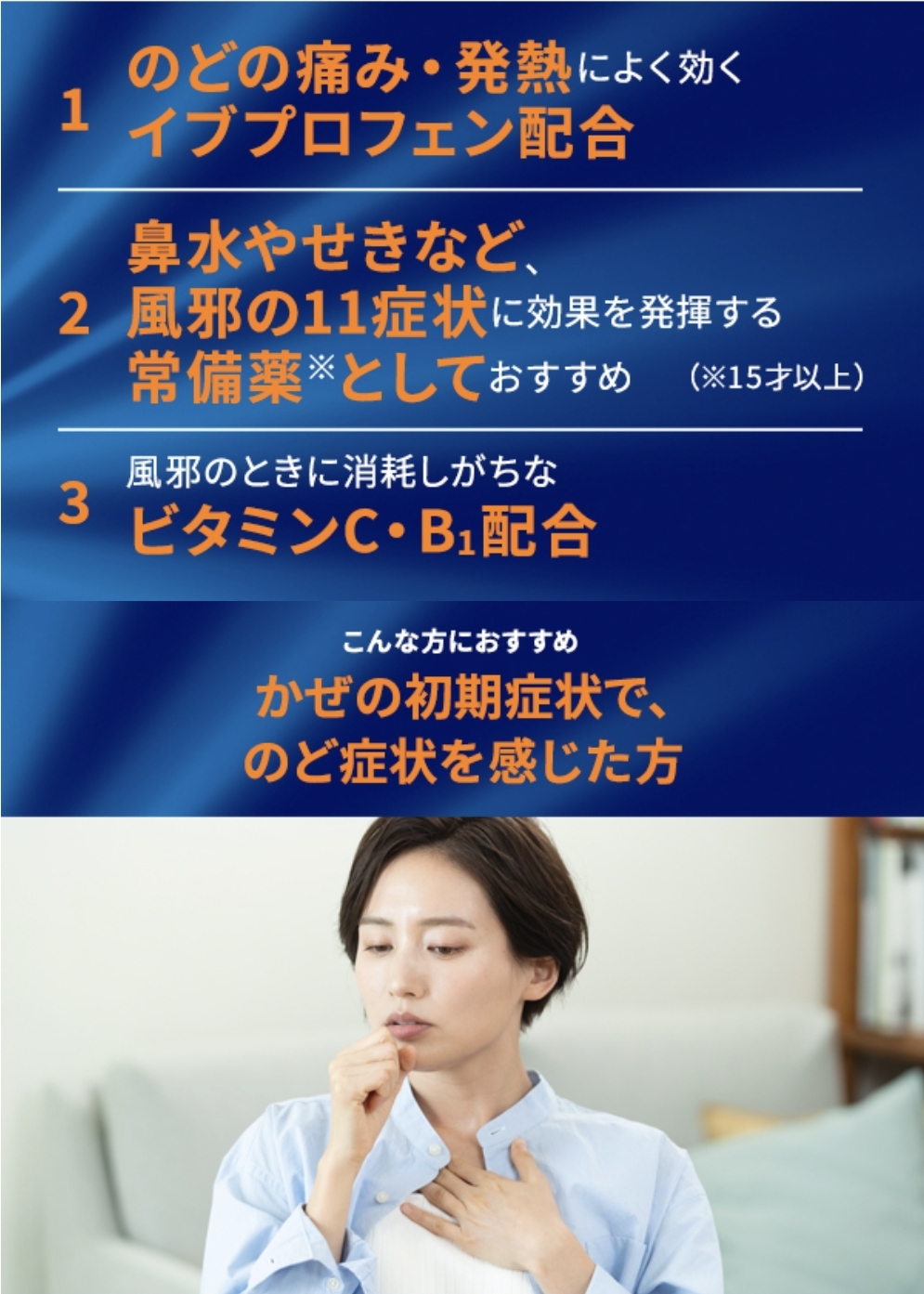 可以紓緩咳嗽、流鼻水、發燒、喉嚨痛、關節肌肉痠痛等感冒症狀。適合患有數種感冒症狀,但又因工作繁重無法即時就醫的上班一族。