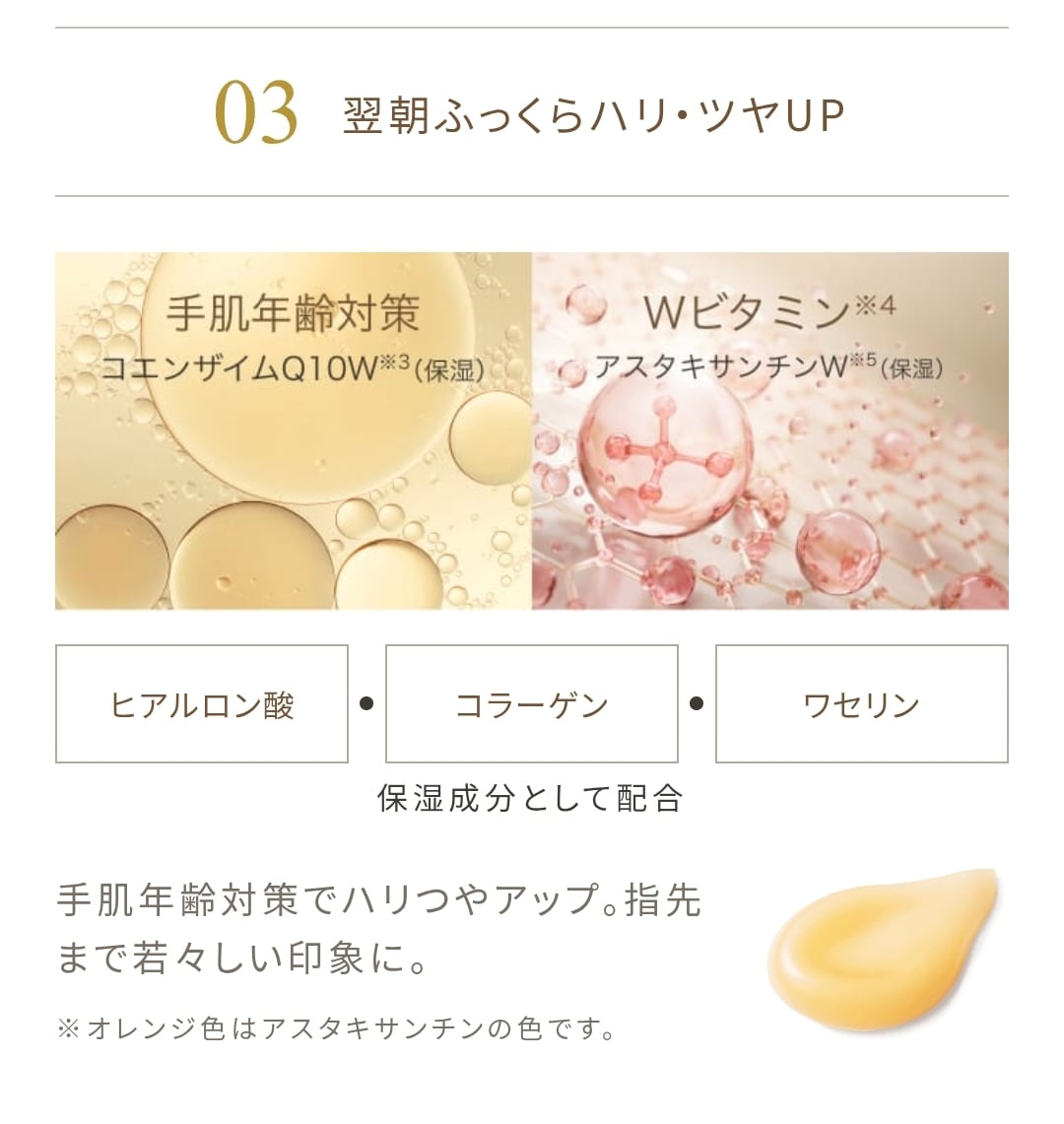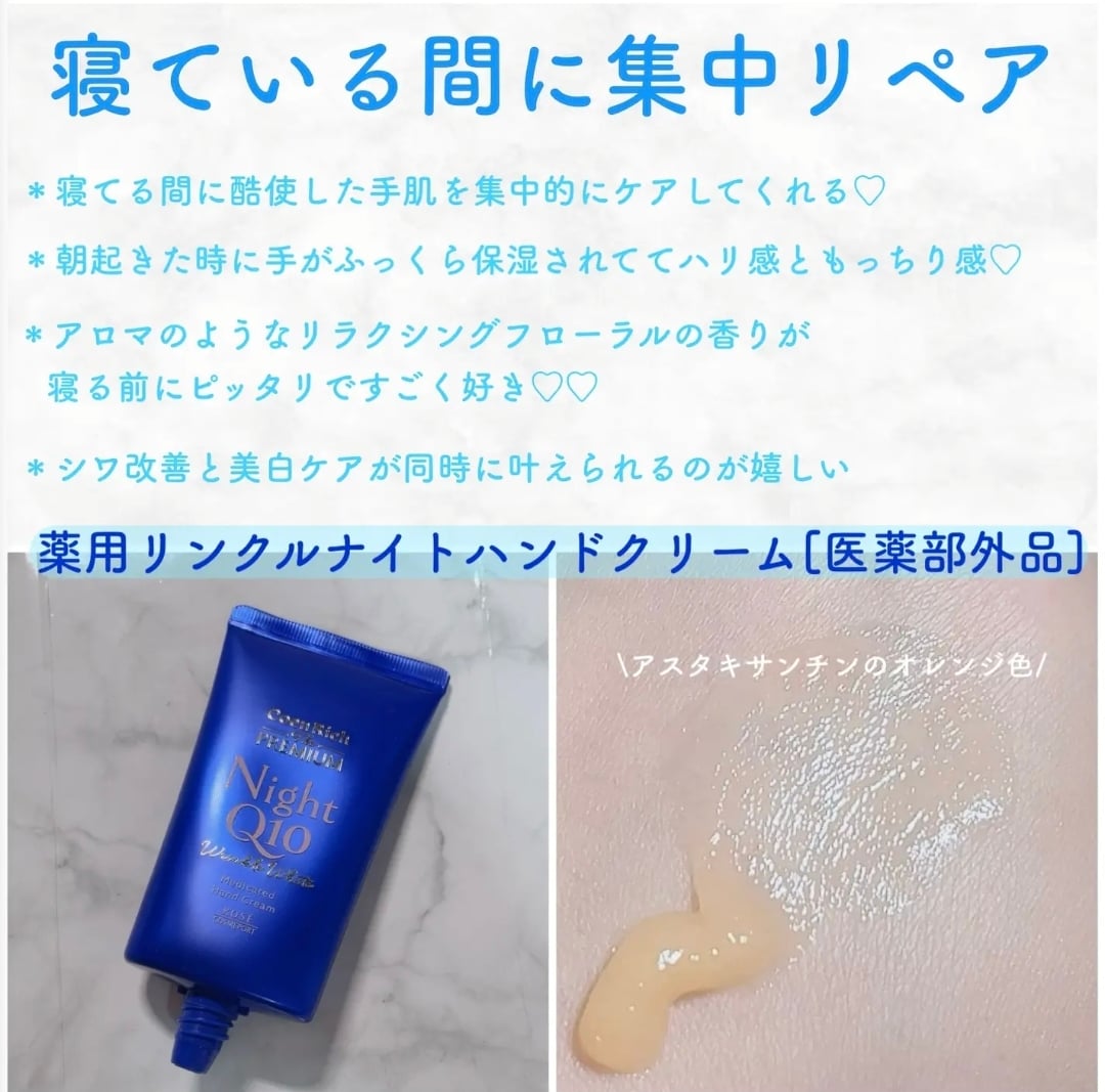 日本 Kose Cosmeport Coen Rich PREMIUM Night Q10 晚間集中抗皺美白護手霜 60g 🏆在日本LDK the Beauty受賞產品獲得A評級🏆 🌜睡眠中進行密集修復,改善皺紋和美白護理 這款滋潤的乳霜融化後能深入滲透肌膚,滋潤肌膚,讓你的雙手在第二天早上依然飽滿光滑。 ✅️ 全天密集修復受損雙手 1️⃣ 活性成分:菸鹼醯胺 睡眠中改善皺紋,美白肌膚 它能抑制黑色素生成,防止瑕疵和雀斑,同時使你的雙手緊緻有光澤。 2️⃣ 高穿透力配方 x 屏蔽效果 含有微膠囊中的滲透促進成分 3️⃣ 護盾包效果,乳木果油和凡士林(保濕) 第二天早上,你的肌膚會飽滿、緊緻、容光煥發。 手部皮膚老化對策:輔酶Q10W(保濕) W維生素,蝦紅素W(保濕) 💧 另含有保濕成分 玻尿酸,膠原,凡士林 透過對抗手部衰老,改善手部肌膚的緊緻度和光澤,使手部肌膚直至指尖都保持年輕狀態。 手霜的顏色是橘色是蝦紅素的顏色。 🪻睡前令人放鬆的花香 令人放鬆、柔和的香氛,以薰衣草、洋甘菊和雪松木為主要成分。 柑橘類水果(檸檬、柳橙、青檸、佛手柑)(蘋果、桃子) 草本(薰衣草、迷迭香、杜松子、洋甘菊) 花香(鈴蘭、茉莉、桂花) 麝香琥珀木香(雪松木、廣藿香) 生產地:日本