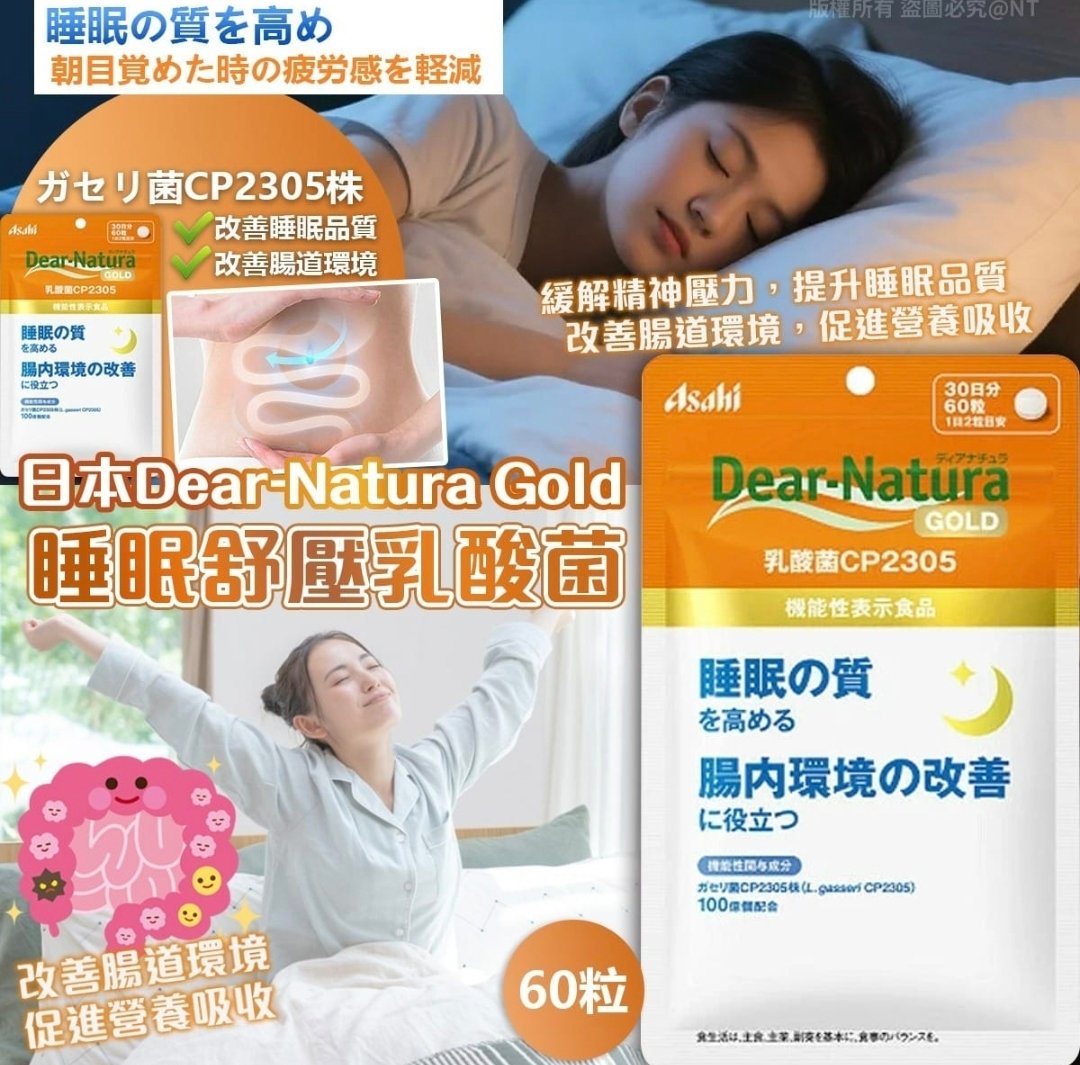 日本ASAHI Dear-Natura CP2305 Gold 睡眠舒壓改善腸道黃金乳酸菌 60粒 現代人面臨各種生活壓力,容易出現情緒低落、睡眠品質下降等問題。 ASAHI朝日乳酸菌CP2305透過調節腸道環境,促進身心健康,幫助您遠離壓力和失眠的困擾。每粒含有100億個ガセリ菌CP2305株,足量補充對於改善腸道菌群平衡非常有幫助。健康的腸道環境不僅能促進營養吸收,增強體質,更能透過腸道-大腦軸線,穩定情緒,提升睡眠品質。 作為日本知名保健品品牌ASAHI朝日,在乳酸菌研究領域有著多年的深度累積。這款乳酸菌CP2305是由朝日獨家研發,從嚴選育的優質乳酸菌菌株中篩選出來。每一粒都經過嚴格的品質管控,確保菌種的活性和穩定性。 成日都好似訓唔夠,壓力又大!Dear-Natura CP2305 Gold 幫到手! 含有加氏乳桿菌CP2305,據報導該菌株能緩解精神壓力,並改善睡眠品質。加氏乳桿菌CP2305 也具有改善腸道環境的功能,進而影響大腦神經傳導物質,達到舒緩情緒、改善睡眠的效果。 調節腸道環境促進身心健康! 含100億個ガセリ菌CP2305株,有效調節腸道菌叢平衡,改善腸道環境,促進營養吸收,增強體質! 透過腸道-大腦軸線,有助於穩定情緒,提升睡眠質量 每日2粒,60粒份量足夠服用30天😊 食用方法: 1. 每日攝取量為2粒,可隨餐飯後食用。 2. 請將整粒吞服,不要咀嚼或掰開。 3. 建議搭配溫開水服用,效果更佳。 使用日期:2027.7 注意:孕婦、幼兒不建議使用。