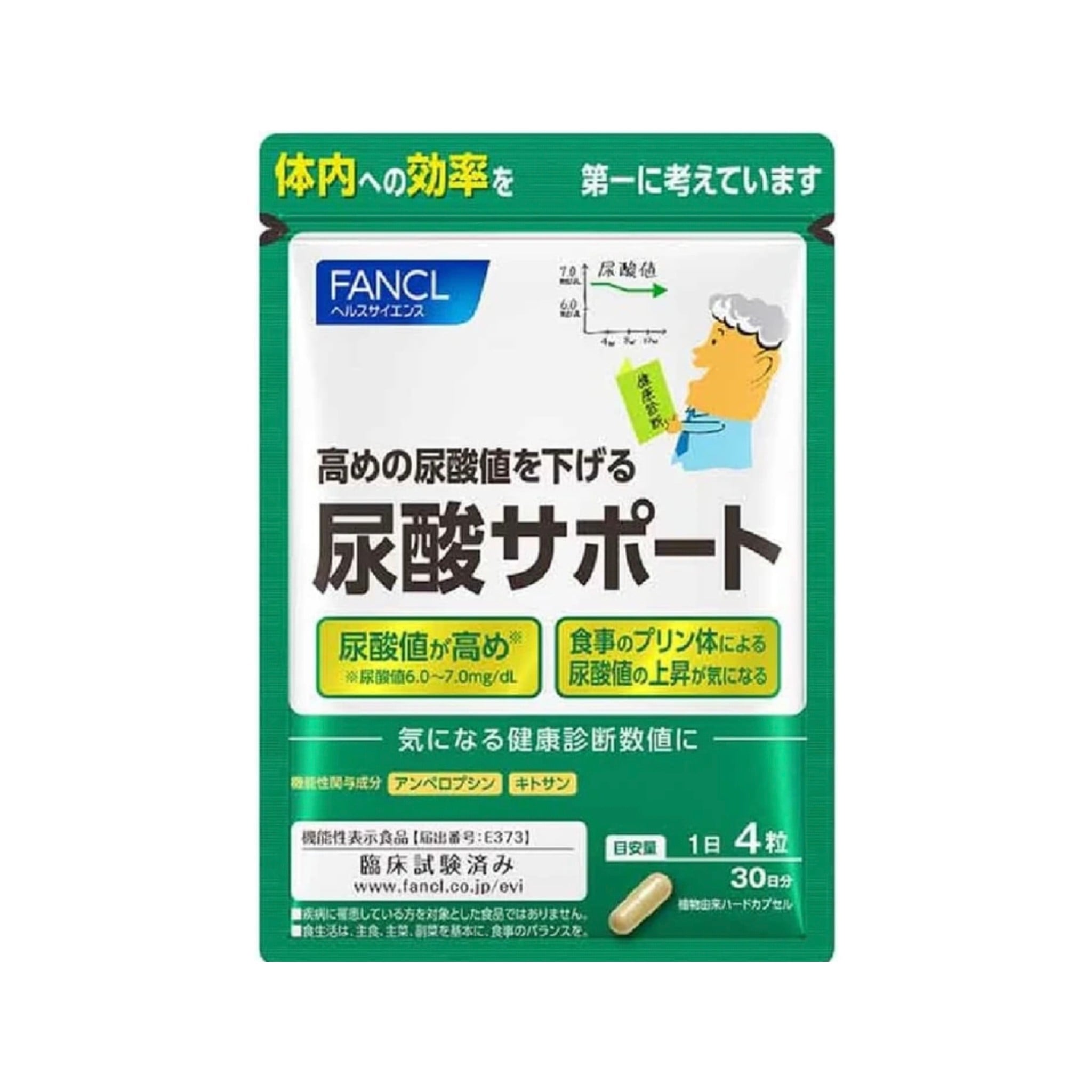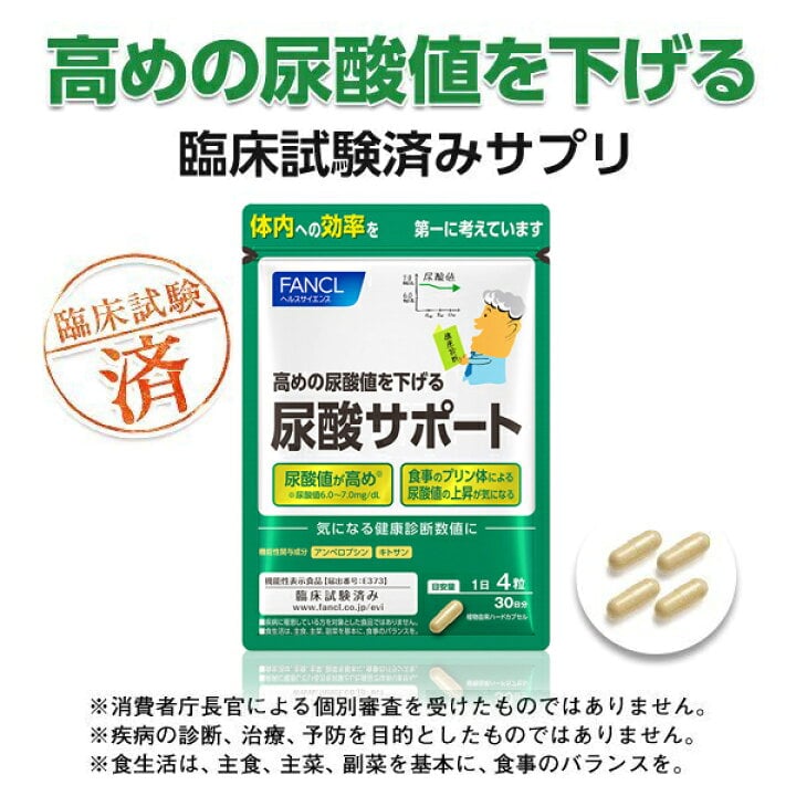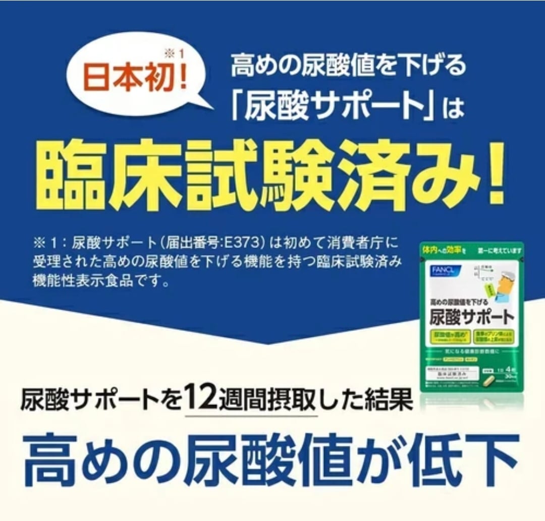 日本FANCL 降低尿酸值支援營養素 120粒 🚨其實維持良好尿酸值是可以減低痛風情況出現👍🏻👍🏻 日本首創!臨床實驗確認可降低較高的尿酸值(6.0~7.0mg/dL)的機能性標示食品。 (FANCL)最新發現的藤茶提取物成分安普羅普辛(Amperopcin) 以及複合配方的甲殼素,實現多角度的應對。 ✅️ 殼聚醣是一種從螃蟹、蝦子等甲殼類動物中提取的多醣,被認為可以抑制嘌呤的吸收。 ✅️ 紫藤苷是紫藤茶中含量豐富的黃酮類化合物之一,紫藤茶在中國已經流行了很長時間。 它具有很強的抗氧化作用,被認為可以抑制尿酸的產生並促進其排出。 本產品含有白藜蘆醇苷和殼聚醣,具有降低高尿酸水平(6.0-7.0mg/dL)和防止尿嘌呤積聚的作用,同時也具有抑制酸度升高的作用。 🩷 對於擔心尿酸水平過高或生活方式習慣的人來說,本產品可為日常措施提供可靠的支持。 通過可靠的作用,支援您每天的應對策略。 尿酸是什麼❓️❓️ 尿酸是嘌呤在體內分解時所產生的代謝廢物。 尿酸在體內不斷產生,暫時積聚在體內的尿酸池中,然後經由尿液和糞便排出體外。 人體每天大約產生和排出 700 毫克尿酸,但如果尿酸的產生和排出之間的平衡被打破,血液中的尿酸水平就會升高。 所以降低尿酸水平和平衡是很重要,要降低高尿酸水平,首先要改善生活方式並服用補充劑。 每日約4粒膠囊,易於吞嚥的膠囊型 袋裝設計,方便攜帶 使用日期:2027年7月 *本產品不用於疾病的診斷、治療或預防。 *均衡飲食,以主食、主菜和配菜為主。 生產地:日本