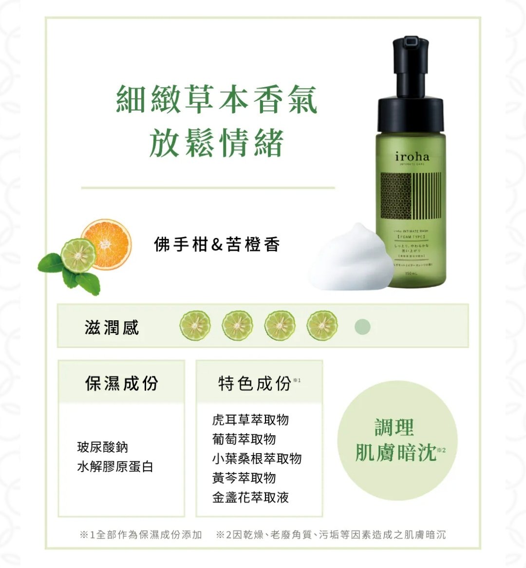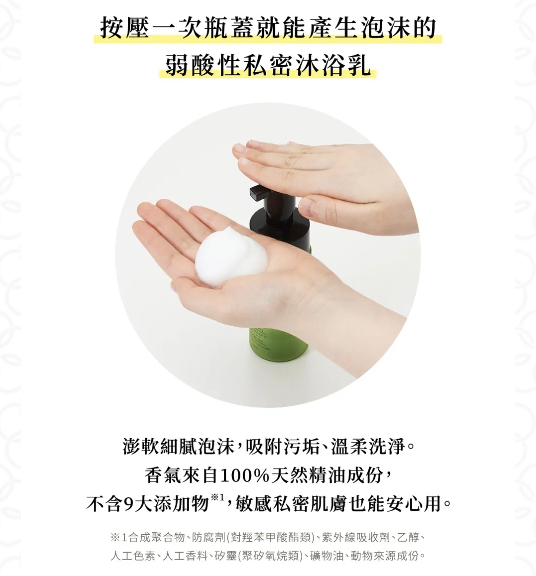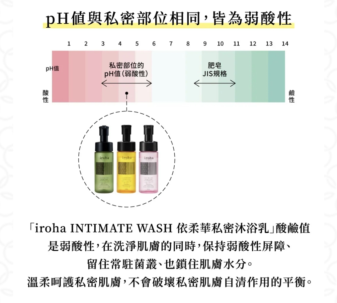 日本iroha INTIMATE CARE 私密護理保濕泡沫 150ml 💥榮獲cosme 2024年度私密嬌嫩區域護理🏆第一位💥 蓬鬆、濕潤、細緻的泡沫‼️可以鎖住水分、水潤柔嫩💧更能去除老廢角質和去異味👍🏻👍🏻難怪呢支在日本超級受女士歡迎😍😍 採用專為私密部位設計的弱酸性配方。按壓一次瓶蓋就能產生泡沫的弱酸性私密護理🩷🩷 洗淨肌膚保持弱酸性屏障、鎖住肌膚水分。溫柔呵護私密肌膚,維持自清作用的平衡。 美肌保濕成分,洗後肌膚水潤柔嫩,更能去除老廢角質和異味。 澎軟細膩泡沫,吸附污垢、溫柔洗淨。 香氣來自100%天然精油成份, 不含9大添加物,敏感私密肌膚也能安心用。 含植物來源成份,調理肌膚暗沉。 虎耳草萃取物,葡萄萃取物,小葉桑根萃取物,黃芩萃取物,金盞花萃取液 仲含有玻尿酸鈉,水解膠原蛋白‼️‼️ pH值與私密部位相同,皆為弱酸性。 酸鹼值是弱酸性,在洗淨肌膚的同時,保持弱酸性屏障、 留住常駐菌叢、也鎖住肌膚水分。 溫柔呵護私密肌膚,不會破壞私密肌膚自清作用的平衡。 細緻草本香氣放鬆情緒:佛手柑和苦橙 生產地:日本