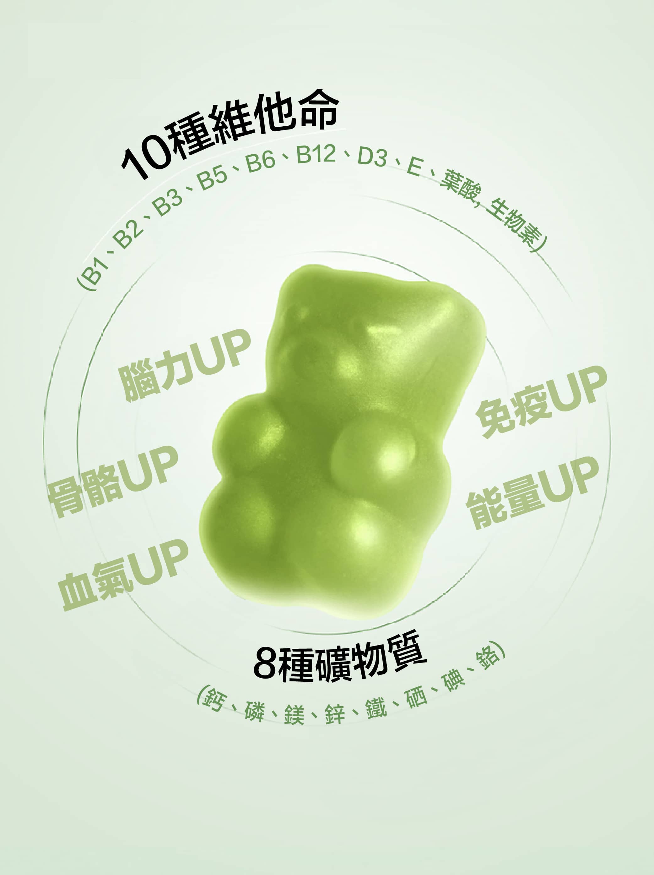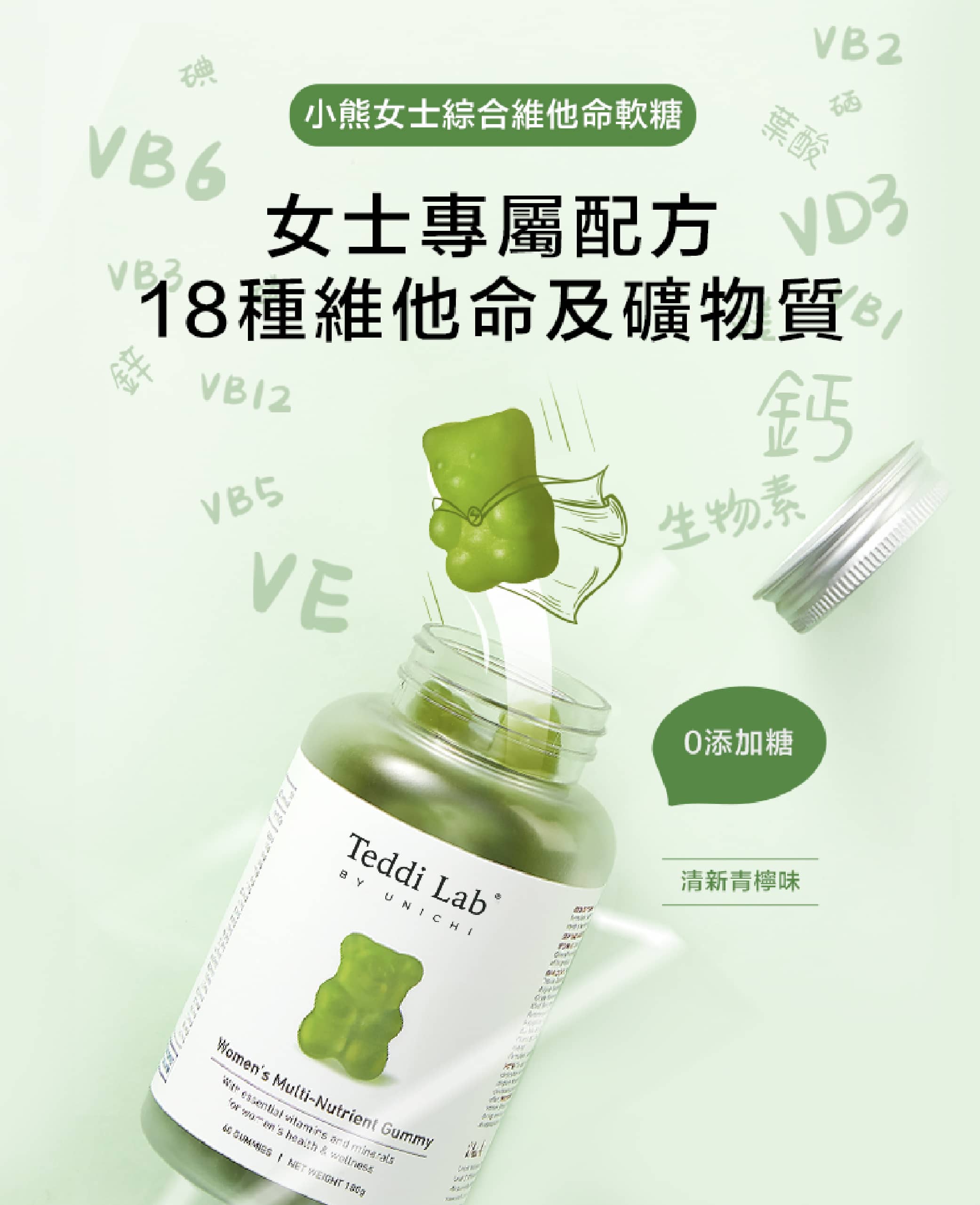 澳洲 Teddi Lab® BY UNICHI Women's Multi-Nutrient Gummy 女性複合維生素軟糖 60粒 含有女性健康所需的必需維生素和礦物質🩷🩷 蘊含10種維他命及8種礦物質,💁♀️專為女性而設的複合配方全面補充各種營養所需! 旨在支持女性的日常營養需求,有助於維持頭髮、皮膚和指甲的健康,並支持能量、新陳代謝和免疫系統。 包括10種B群維他命、維他命D3、E、生物素、以及鈣、鎂、鋅、鐵等8種礦物質。 ✅強化免疫系統 ✅提升骨骼🦴及牙齒健康🦷 ✅養氣補血❤️🔥能量爆滿 ✅護髮美甲 ✅可愛的小熊造型賣相滿分 ✅清新青檸味🍋🟩🍋🟩、0️⃣添加糖、美味可口😋 不含額外添加糖,低脂肪,並含有抗氧化劑。 建議食用方法: 成人每日咀嚼2粒。 儲存方法: 避免陽光直射,置於乾燥通風的地方。避免兒童接觸。