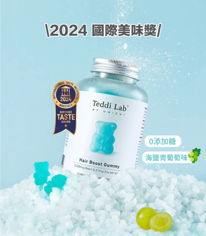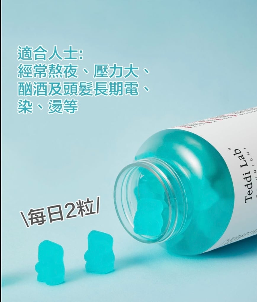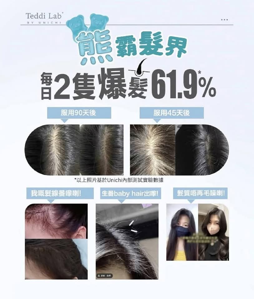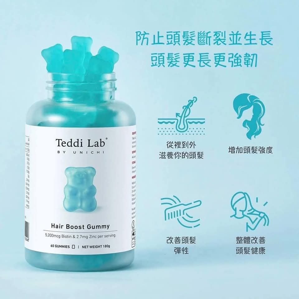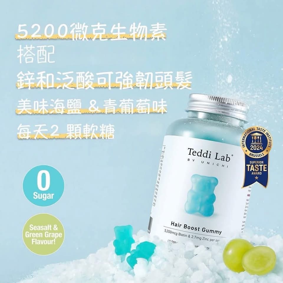 澳洲Teddi Lab® BY UNICHI 生髮養髮小熊軟糖 海鹽青提味 60粒 銷量No.1 Unichi👍🏻科學專業配方,3樽為一個療程,髮量up up up ! 日日捱夜、壓力大,搞度頭髮甩唔停😵?✨ Unichi 小熊爆髮軟糖 科研實證增厚髮量🆙✨ 每日2️⃣粒輕鬆養出濃密豐盈秀髮,連髮膚甲一次呵護👍🏻! 特殊配方的含有 5,200 微克生物素,其中含有鋅和泛酸,可支持頭髮生長和活力。 Unichi Hair Boost Gummy 更採用科學配方,含有多種維生素(維生素 A、維生素 C、維生素 E)。 每顆咀嚼維生素軟糖都具有濃郁的海鹽和青提風味,共同作用以強化髮絲,促進頭皮健康,並增強整體頭髮的厚度。 官方建議三瓶一個週期療程!約連續吃三個月,這樣的效果最好! ⭕️全球生物素含量No.1%,含量是市面上普通產品的1.66倍 ,2粒5200微克,足量補充生髮護髮所需 ⭕️富含生物素、鋅、泛酸、維生素AICIE ⭕️生物素幫助角蛋白生成,修護髮芯、強韌秀髮,全面促生柔順秀髮。 ⭕️泛酸促進毛囊生長健康,髮根不斷新生。 ⭕️維生素A、C、E維持角質層正常代謝,養護頭皮、改善脫屑、秀髮亮澤柔順。 👇👇生物素👇👇 幫助能量代謝 有助於促進新陳代謝、產生能量並增強體力。 幫助頭髮生長 增加頭髮的彈性並防止乾燥,達到強健髮質、減緩脫落的效果。 維持指甲強健 生物素身為合成角蛋白的關鍵營養素,足量補充能提高指甲的強韌度,指甲防止斷裂、脆化。 增進皮膚與黏膜健康 幫助緩解過敏症狀,減輕濕疹或皮膚炎的不適反應。 維持神經認知功能 有助於延緩大腦認知功能退化、增強記憶力,對神經系統與大腦健康有益。 緩解多發性硬化症 減緩多發性硬化症的病程惡化、改善病症。 維持血糖穩定 有利於血糖控制 🔸使用方法:每日2粒咀嚼服用,建議空腹前吃 ⚠️注意事項:12歲以下的兒童不宜使用