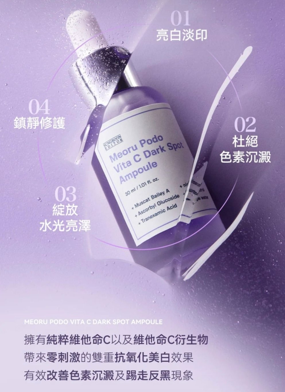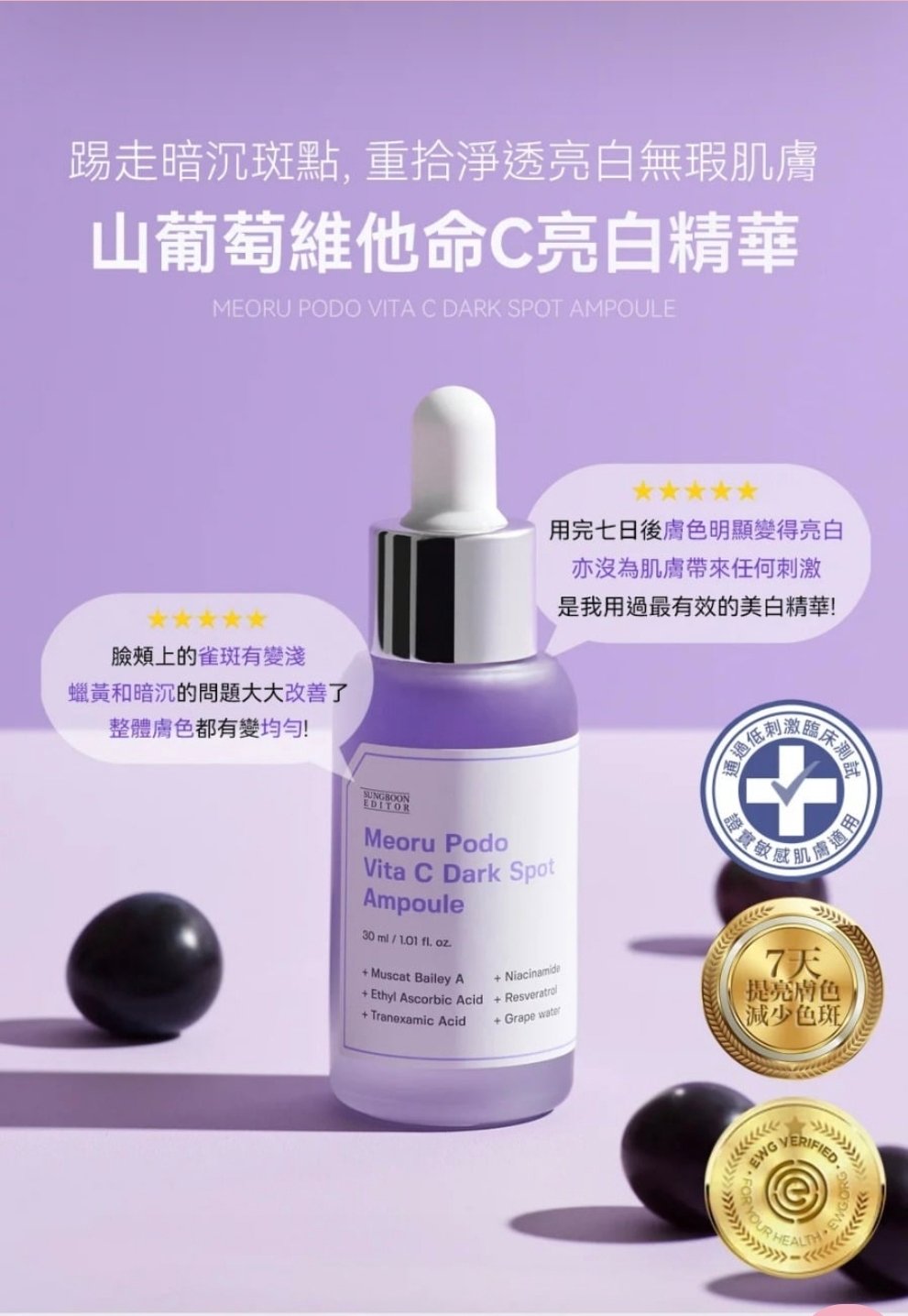 韓國 SUNGBOON EDITOR 山葡萄維他命C亮白淡斑精華 限定套裝 1套2支30ml 🔥🔥韓國OLIVEYOUNG 限定套裝 30ml + 30ml 含高濃度高劑量維生素C,令你實現7日美白透亮🌟🌟 😍平時買1支30ml最平都要百幾蚊,而家套裝有2支30ml,都只係$138💥真心超抵‼️‼️ ✅️ 踢走暗沉斑點,重拾淨透亮白無瑕肌膚! 經低刺激臨床測試,證實適用於敏感肌膚。 🍇 擁有山葡萄維他命C成份,帶來零刺激的抗氧化美白效果! 配合維他命C衍生物-乙基抗壞血酸,有效杜絕色素沉澱及減少反黑現象。 ✅️ 含有10種玻尿酸、葡萄籽油膠囊,讓肌膚綻放水光亮澤。 再加入鎮靜修護成份,4重積雪草及尿囊素,能快速穏定受刺激肌膚! 清爽易吸收質地,適合在潮濕悶熱的天氣下使用 生產地:韓國