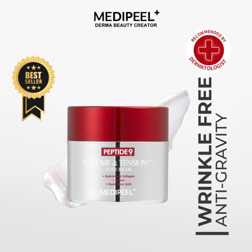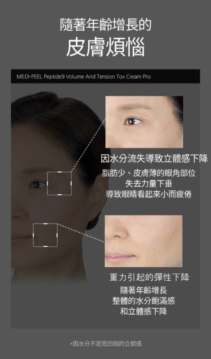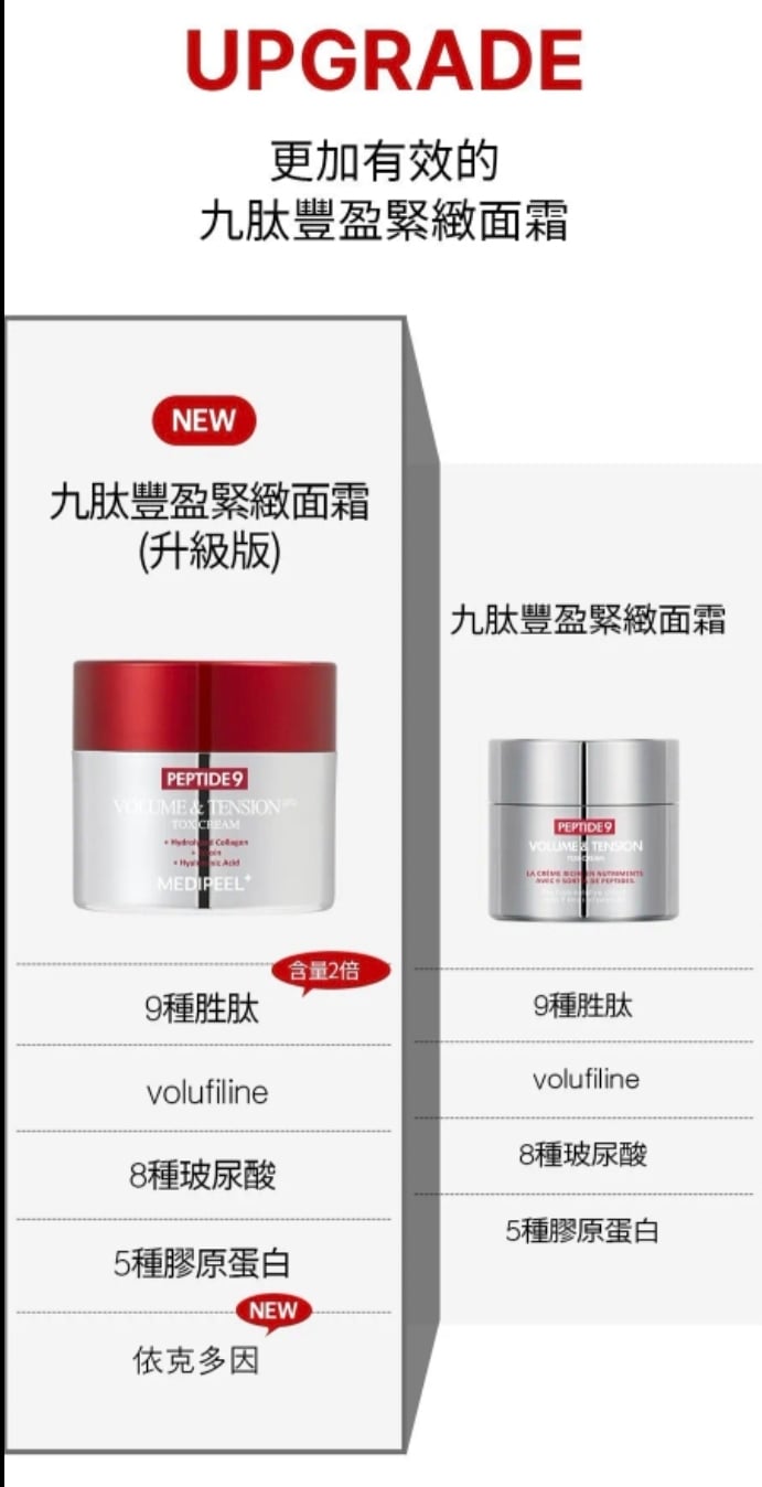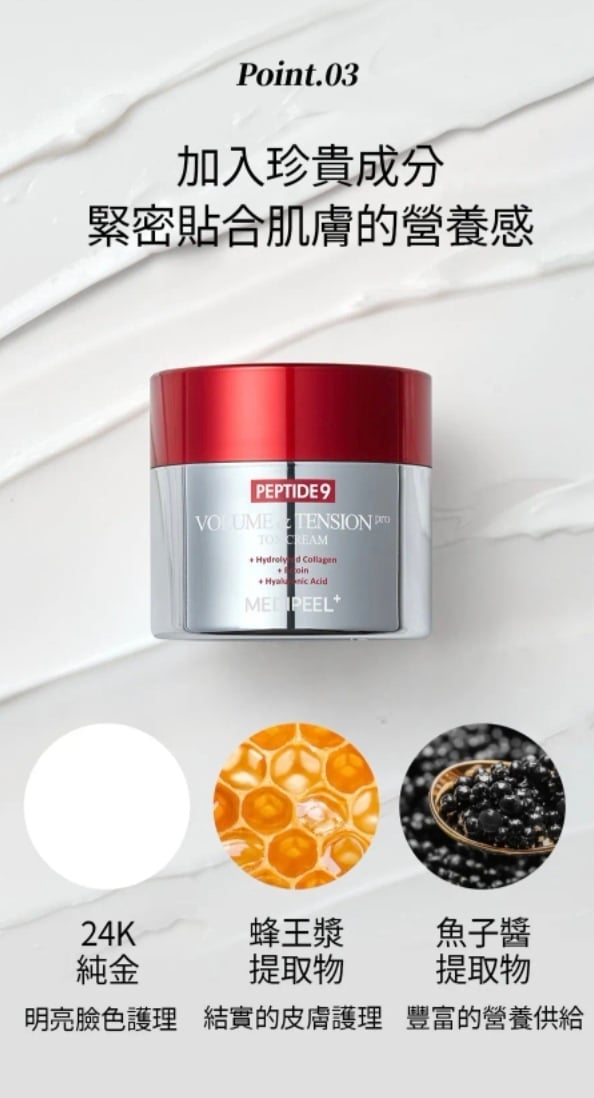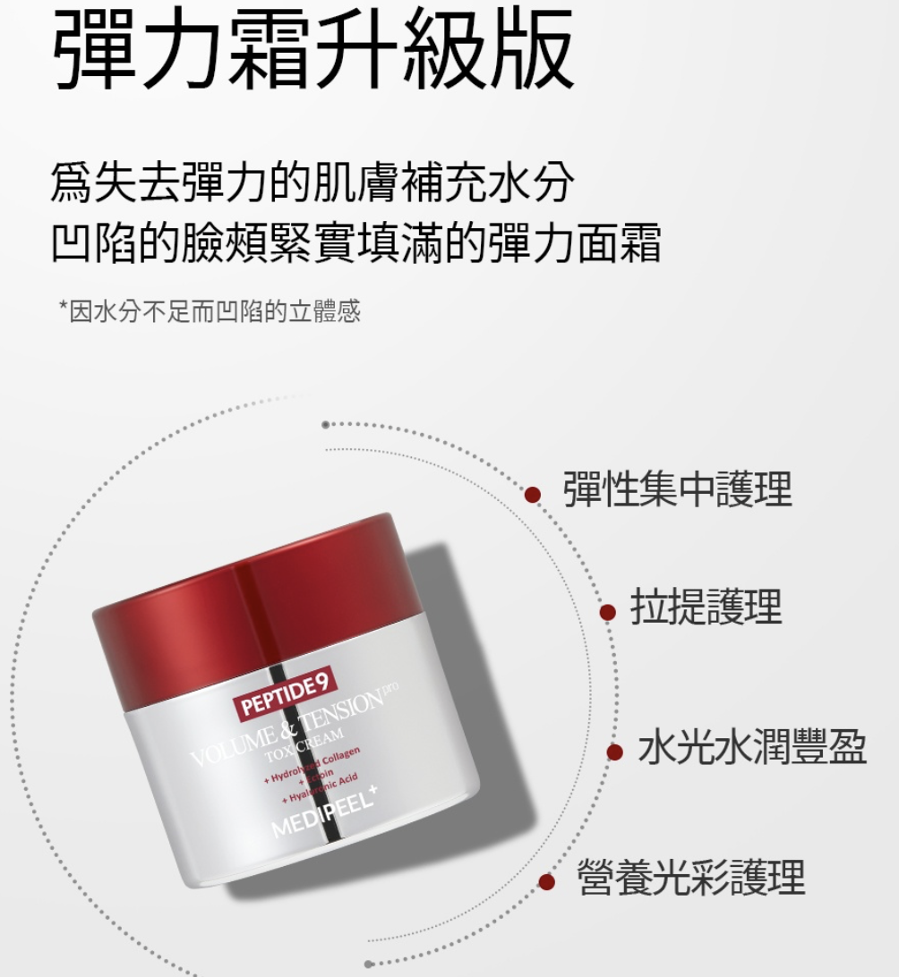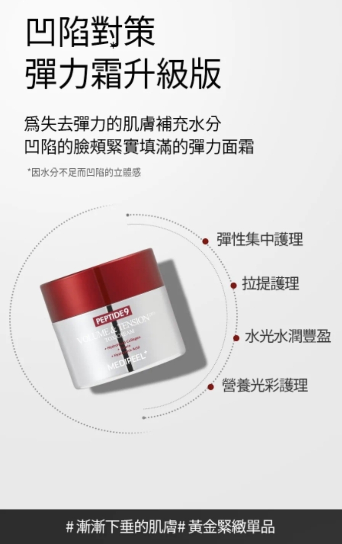 韓國MEDI-PEEL 升級版 九肽逆齡豐盈緊緻提升抗皺面霜 50ml Peptide 9 Volume & Tension Tox Cream Pro 抗皺緊緻提拉一瓶搞掂‼️‼️唔使打針都做到V面💥韓國皮膚科都推薦💥 🌟升級配方,Peptide 9緊緻提升抗皺面霜嘅新版! 💖 「快2倍吸收,即刻見證緊緻V面!」 由韓國美容專家MEDI-PEEL 製造,提供高效能且經過科學驗證的護膚效果。 採用先進的抗衰老配方,能有效撫平並緊緻肌膚,顯著減少皺紋,恢復肌膚彈性。 有助於強化臉部輪廓,改善肌膚緊實度。 含有Volufilin、膠原蛋白複合物、水解彈性蛋白、9種胜肽、透明質酸、積雪草成分等活性成分。 想塊面嘭潤彈滑,仲要輪廓緊緻上揚?新升級嘅Peptide 9面霜幫到你! 重點功效:✨ ✅ 2倍速滲透—活性成分直達肌底,快人一步見效! ✅ 即時拉提—鬆垮面型bye bye,下顎線條即刻sharp! ✅ 深層抗皺—KO法令紋、眼周細紋,回復年輕嘭彈~ ✅ 膠原補給—水解彈性蛋白+獨家Volyufilin,撐起塌陷肌! 用法: 是在護膚的最後階段,取適量均勻塗抹於臉部。 生產地:韓國