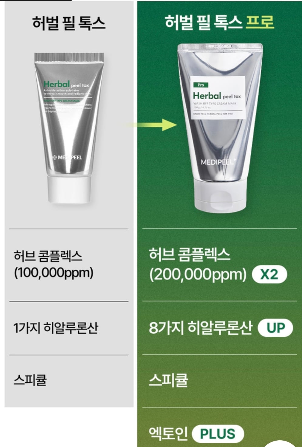 韓國MEDIPEEL HERBAL PEEL TOX PRO 升級專業海藻矽針嫩膚面膜 120g 最新UPGRADE版,草本複合體(200,000ppm),新添8種玻尿酸,新添依克多因 ✅️ 死皮護理,清透肌膚保養,皮膚保濕,舒緩肌膚 🚨 獨特配方能夠徹底去除甚至隱藏的死皮細胞。 蘊含雙倍強化草本複合物和微生物刺,只需輕輕一按,即可在家中享受舒適的美容護理。 蘊含雙倍草本複合物,帶來卓越的去角質效果! 黑豆萃取物、黑芝麻萃取物、茶樹萃取物、山藥萃取物、牛眼芽萃取物、艾蒿萃取物、五葉地錦葉萃取物、鼠尾草葉萃取物、枸杞萃取物、桑根萃取物、積雪草葉萃取物、1,2-己二醇 ✅️ 含有微生物刺(骨針),可協同去除角質! 什麼是骨針❓️❓️ 這是一種全新的原料概念,它完全從天然成分中提取海綿的骨針,並將其精煉成針狀顆粒,可以刺激皮膚並提供營養。 💧 蘊含8種玻尿酸,為肌膚補水。 它能深層滋潤清潔、去角質後的肌膚,為肌膚補充水分而不會使其乾燥。 幫助皮膚修復,完成去殼雞蛋光滑緊實的表皮。 ✅️ 含有依克多因,有助於修復肌膚,洗淨後肌膚如煮熟的雞蛋般明亮。 經過皮膚刺激測試 已完成皮膚刺激性測試,因此即使是敏感肌膚的人也可以安全溫和地使用。 💥 推薦你使用: 需要溫和去角質產品的人 關注肌膚暗沉無光的人 因死皮細胞脫落而導致妝容脫落的人 由於皮脂分泌過多而導致皮膚油膩的人 🩷 用法: 步驟1:洗完臉後,使用爽膚水均勻膚色。 步驟2:取適量塗抹於整個臉部,(避開眼周區域)。 步驟3:用手不斷按壓數分鐘,幫助吸收微小的生物骨針。 步驟4:15分鐘後,用溫水洗臉。 🚨 注意事項: *微針刺入時,您可能會感到暫時的刺痛感。 *過度摩擦皮膚可能會刺激皮膚,因此只能用於油脂分泌較多的部位,如鼻子和下巴,輕輕摩擦 3-4 次。 生產地:韓國