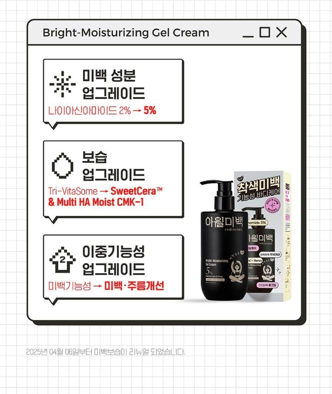 韓國i will me: back 美白保濕亮白啫喱霜 300ml 黑色款是針對暗沉角質&色素沉著、強力保濕‼️‼️ 係韓國賣得最好就係黑色呢款,而係olive young 亦是NO.1 🏆🏆 ✅️ 專為身體暗沉部位設計:手肘、膝蓋、腳踝、腋下都OK! 大容量300ml:日常全身使用、CP值超高 💥💥核心成分與功效 1️⃣ 5%高濃度菸鹼醯胺 針對膚色暗沉與色素沉澱,有效改善整體膚色不均。 2️⃣ 玻尿酸 + 蘆薈 + 積雪草 提供長效保濕,同時舒緩修護,改善乾燥與粗糙問題。 3️⃣ 水感凝膠質地 質地輕盈,吸收快速,使用後不黏膩、不沾衣物。 ✅️ 全身適用:特別適合塗抹於手肘、膝蓋、腳踝、腋下等易暗沉部位。 適合那類人群使用? 希望改善膚色不均、關節處暗沉者。 偏好清爽質地、拒絕黏膩感的身體保養愛好者。 尋找兼具「溫和提亮」與「保濕修護」功效的日常身體乳。 注重產品容量與價格平衡的消費者。 用法:每日沐浴後,取適量塗抹於身體肌膚,輕輕按摩至吸收即可。 生產地:韓國