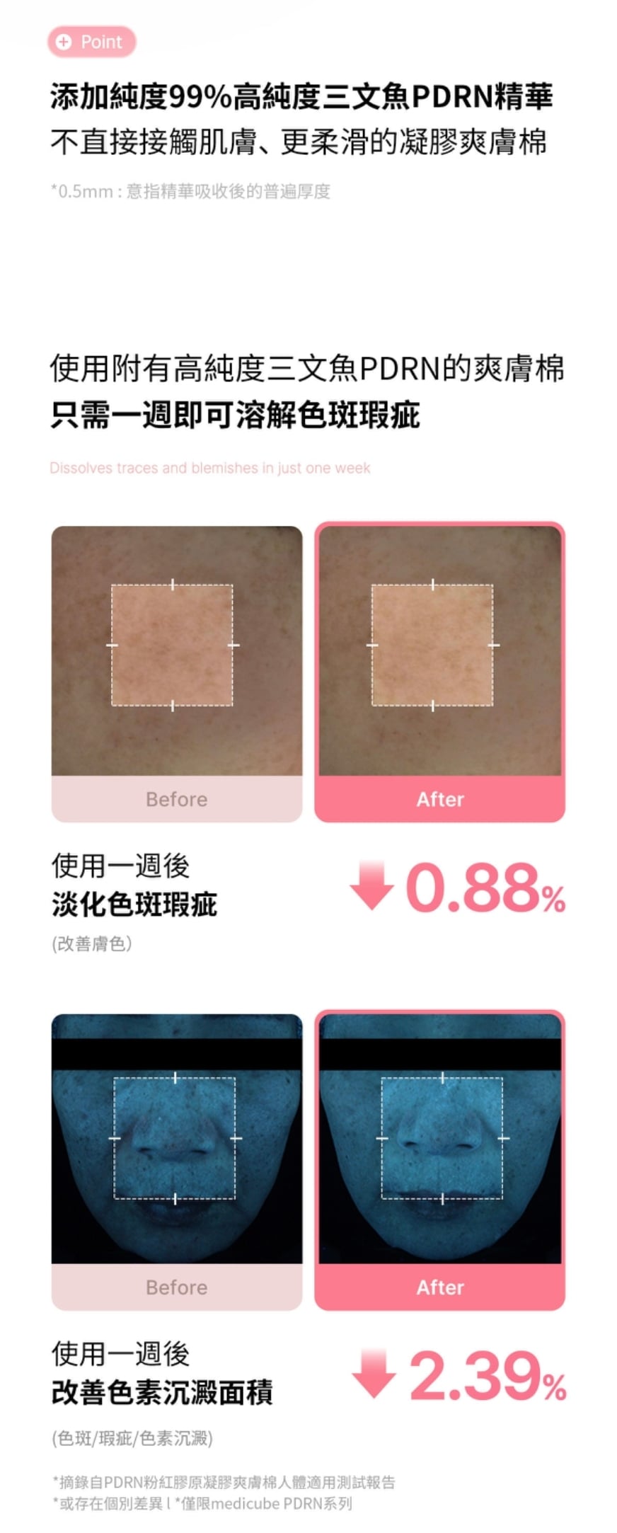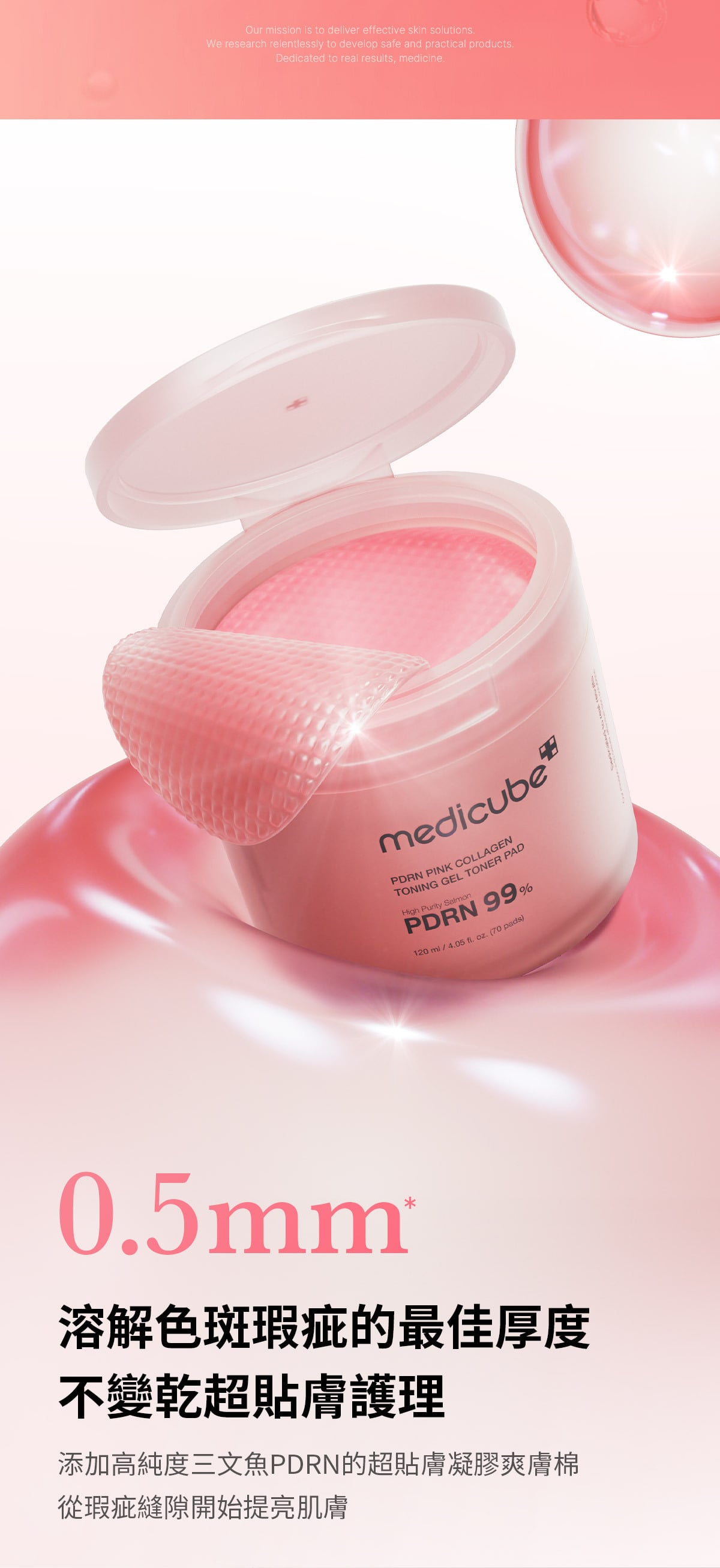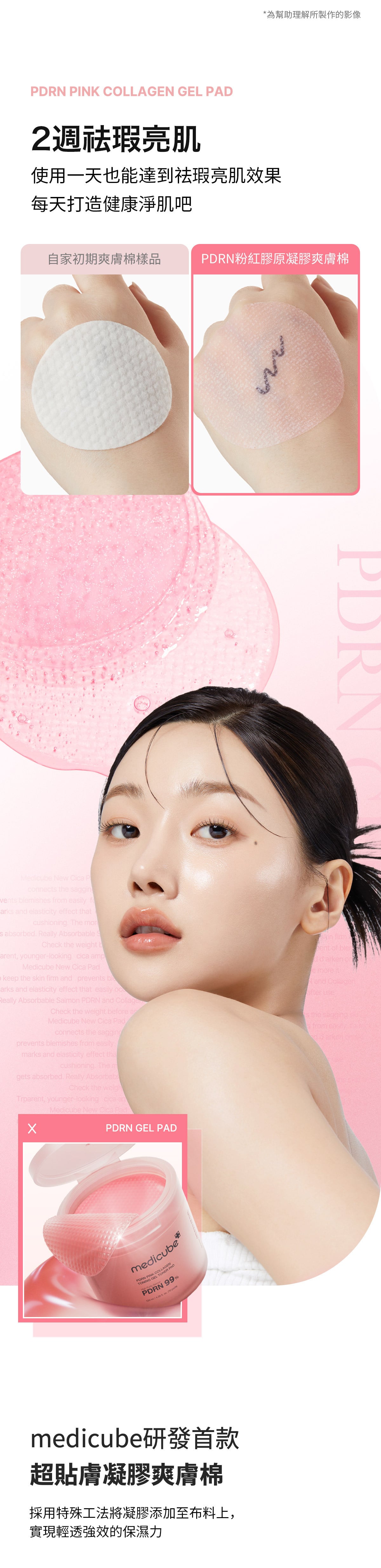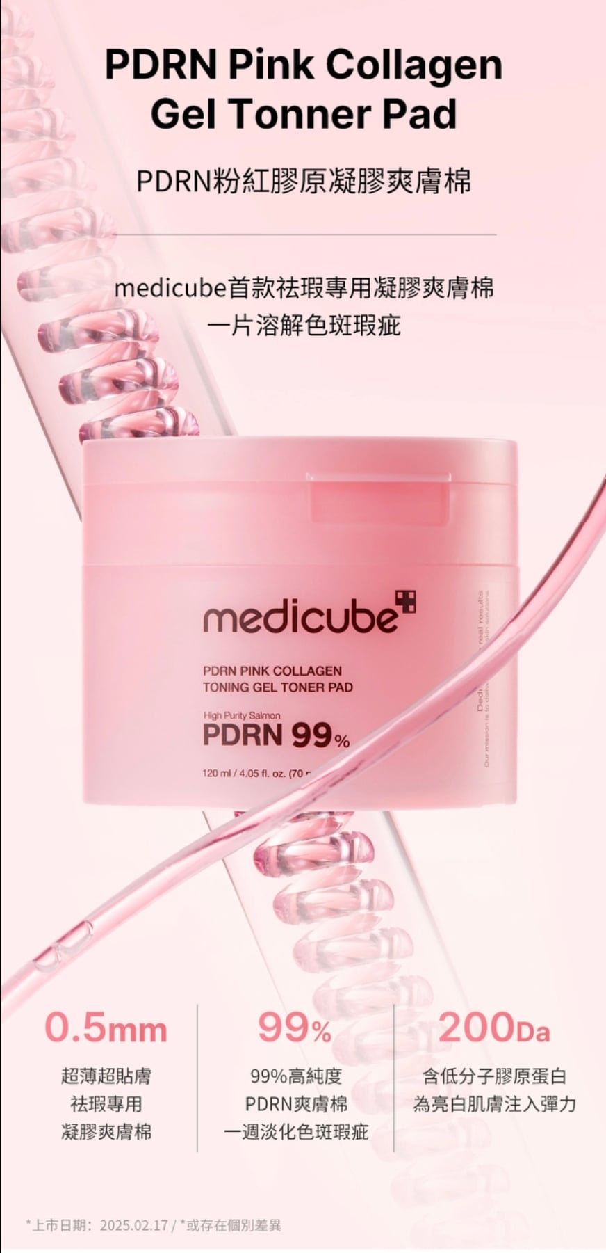 韓國medicube PDRN 99% 粉紅膠原凝膠爽膚棉 70片 🩷 medicube首款祛瑕專用凝膠爽膚棉💥一片溶解色斑瑕疵💥 採用99%高純度鮭魚PDRN及超低分子膠原蛋白(200Da),深層修復肌膚,促進細胞再生,淡化色斑與細紋,瞬間提亮暗沉膚色,恢復肌膚彈性與緊緻。 0.5mm超薄凝膠棉片,服貼貼合瑕疵部位,長效保濕不易乾燥! 適合所有膚質,包括敏感肌。 煙酰胺阻斷黑色素移動,羥基積雪草苷助力修復肌膚屏障,雙重功效修護肌膚,讓肌膚時刻水潤透亮。 使用簡單方便,只需將高濃度PDRN精華倒入棉片盒中,凝膠化後貼於肌膚,快速打造彈潤飽滿肌膚。 適合日常保養及妝前打底,助力塑造持久水嫩光采,讓肌膚由內而外閃耀健康光澤,重拾自信美肌。 😍 特點: 含99%高純度鮭魚PDRN精華,一倒入即瞬變彈潤凝膠 迅速溶解色斑瑕疵,改善色素沉澱及膚色暗沉。 添加煙酰胺,有效阻斷黑色素移動,預防膚色不均。 含羥基積雪草苷,提升肌膚屏障修復力,淡化頑固色斑。 採用200Da超低分子膠原蛋白,快速滲透肌底,提升肌膚彈性與緊緻度。 0.5mm超薄凝膠爽膚棉片,服貼肌膚瑕疵部位。 經低刺激人體適用測試,適合敏感肌膚使用。 用法: 撕開PDRN精華包裝袋,將精華倒入爽膚棉盒內 爽膚棉凝膠化後敷於想改善的部位 生產地:韓國