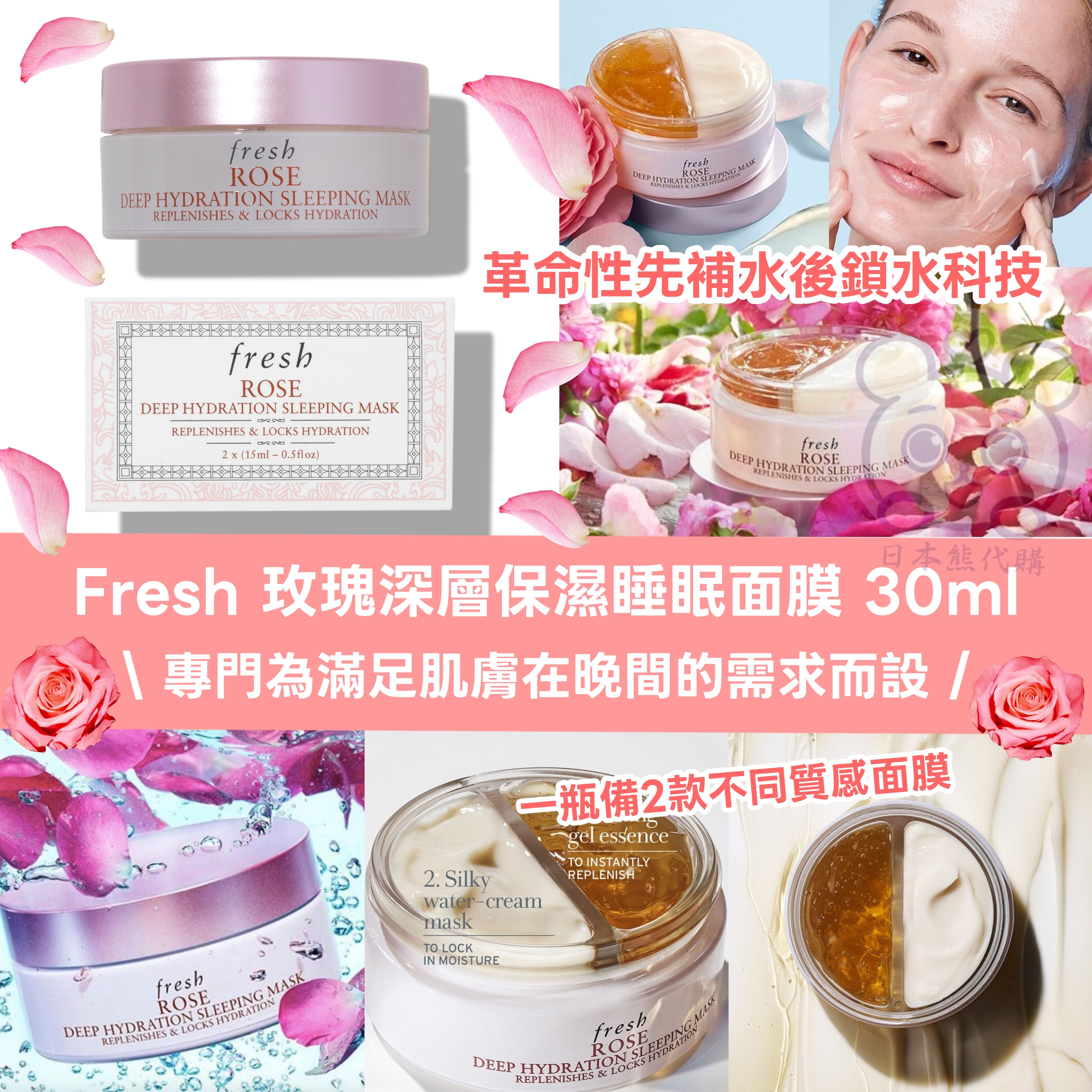 Fresh 玫瑰深層保濕睡眠面膜 30ml 💥專門為滿足肌膚在晚間的需求而設💥 打開會見到有2種塗抹式面膜,每邊有15ml‼️ ✅️ 這款兩步面膜將玫瑰的護膚好處結合先進的定時釋放科技﹙time-release technology﹚ 🚨是Fresh面膜選單上最保濕的面膜🚨 一向重視天然純淨既Fresh推出既玫瑰深層保濕睡眠面膜有兩步既修護面膜✨可以即時補充肌膚於日間流失既水分,同時夜晚將水分好好鎖住👍🏻 🏆革命性先補水後鎖水科技,令肌膚係晚間修護既黃金時間獲得深層滋潤補濕🥰 🩷 主要成分包括透明質酸、大馬士革玫瑰提取 、玫瑰水加上定時釋放科技,可以係皮膚表面形成保濕微型網絡:阿拉伯膠和海藻膠形成緊密既網狀結構,逐漸釋放絲氨酸以達到長效保濕效果💦 2款不同質感面膜,啫喱面膜清涼舒適,再敷上霜狀面膜能鎖住水份,臨睡前使用第二天肌膚更水潤容易上妝,真心值得一試👍🏻 為肌膚提供深層滋潤和鎖水功效‼️ 1️⃣ 琥珀色啫喱精華液(第一步)具有鎮靜作用,富含玫瑰水和大馬士革玫瑰精華。 2️⃣ 絲滑水潤霜狀面膜(第二步)使用定時釋放科技,含有月見草萃取物,有助於鎖住水分。 用法: 1️⃣ 將琥珀色凝膠精華塗抹在臉上,使其吸收後。 2️⃣ 緊接著敷上絲滑水潤面膜,然後就可以去睡覺。 建議在晚間潔臉後使用,先塗抹啫喱精華,再塗抹水潤霜狀面膜,然後敷整夜。起床後就可以清洗!