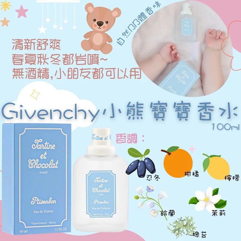 🧸Givenchy 小熊寶寶BB淡香水 100ml 🧸 春夏秋冬都適用嘅爽身粉味香水 噴完感覺自己都變成BB一樣💕 香味設計來源於↘️👼BB身體散發出嘅獨特自然體香味! 初生嬰兒嘅BB又是似爽身粉味😍 ✅自然溫和✅不刺激✅無酒精 GIVENCHY Ptisenbon小熊寶寶是全球首款大人兒童都用得嘅香水👍🏻 前調:香橙、⽩松⾹和檸檬 中調:忍冬、茉莉和鈴蘭 尾調:琥珀、麝香、橡苔以及巴西花梨木。 清清甜甜的味道像剛洗完澡的嬰兒,是能讓人心靈平靜的清新香氣。 產地: 法國